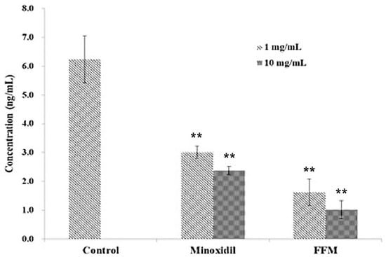 Dihydrotestosterone (DHT) production in rat liver tissue of Minoxidil- and FFM-treated groups at different concentrations. Values are mean ± standard deviations of three (n = 3) individual experiments. Control, Propylene glycol; FFM is mixture of F2 and F3 fractions; Minoxidil was used as positive control to evaluate the production of DHT. ** p < 0.01 compared with the control.