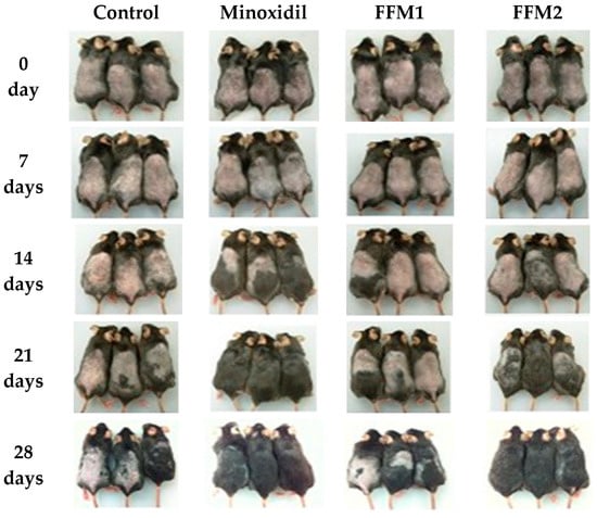 The hair cycle is regulated by complex epithelial–mesenchymal interactions. Several growth factors in the dermal papilla and overlying epithelial cells are known to interact with each other during the progression of the hair growth cycle [41]. In this study, the hair growth-promoting activity of FFM was observed when applied topically once a day for 4 weeks to C57BL/6 mice at two different dosages, 5 and 10 mg/day (FFM1 and FFM2, respectively). Minoxidil (5 mg/day) was similarly applied onto the backs of a separate group of mice as a positive control. As shown in Figure 5, from the 14th day, the color of dorsal skin showed a more rapid change to black in the Minoxidil-treated group, suggesting active transition to the anagen phase. Hair growth on the 28th day was more prominent in the FFM2 group compared with those of the control and Minoxidil group.