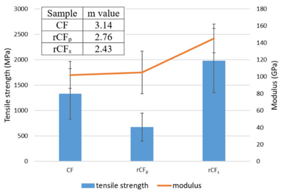 Tensile strength and modulus of CF, rCFp, and rCFs and the corresponding shape parameter m.