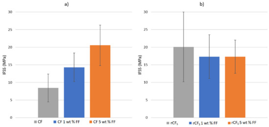 However, when considering the IFSS results of the recycled fibers, the application of the surface sizing did not appear to have the same effect, as seen in Figure 3b. On the other hand, the un-sized rCFs samples already had the same “increased” IFSS value of 20.1 MPa, similar to the CF samples sized with 5 wt% sizing solution. It is also noteworthy that the IFSS of the rCFs was higher than the previously [21] reported values for un-sized rCF and PP. Applying 1 wt% or 5 wt% sizing solutions to the rCFS fibers did not increase the IFSS any further. The IFSS of rCFs resized with 1 wt% and 5 wt% solids content FF solutions was 17.3 MPa for both. The exact value appeared slightly lower than that of the un-sized rCFs but was well within the deviation range, as seen from Figure 3b. The increased surface topography of rCFS was most likely the main contributor to the enhanced IFSS, as noted in other similar studies [19,27,28,29]. The surface of both of the rCF types (conventional and reactive pyrolysis) was more textured and rougher in the loading direction than of the pristine CFs (Figure 1). This increased the frictional forces and mechanical adhesion at the interphase and thus also the IFSS. In addition, the fiber surface was most likely oxidized during the reactive pyrolysis, which is known to contribute favorably to the interfacial adhesion [30]. The application of resizing, on one hand, smoothened out the fiber surface but also simultaneously enhanced the adhesion by increasing hydrogen bonding at the surface. Hence, no dramatic change in the IFSS was noted after the resizing process. The IFSS of rCFp was measured to be similar to the rCFs at 21.3 MPa (stdev 4.9 MPa) owing to the pronounced surface topography. However, no resizing trials were done with it because of its poor tensile properties.