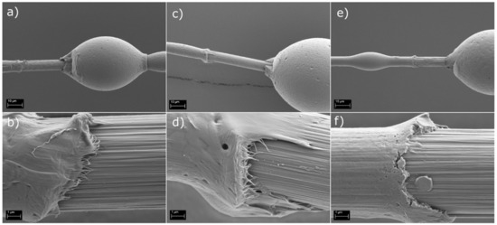 The SEM images in Figure 4 support this notion. It can be seen that the PP matrix was more strongly bonded to the CF fiber when 1 wt% (Figure 4c,d) and 5 wt% (Figure 4e,f) sizing solutions were applied, as is suggested by the IFSS results. The un-sized fiber surface (Figure 4a,b) had a clear gap between the matrix and fiber surface at the debonding site. In addition, the detached fiber surface was clean, with no matrix residue left from the detached PP droplet. However, the amount of adherent matrix residue increased with the application of the surface sizing and even more so as the sizing solution concentration increased. In addition, the gap between fiber and matrix disappeared and was replaced with a strong interphase, even after droplet detachment, as seen from Figure 4e,f.