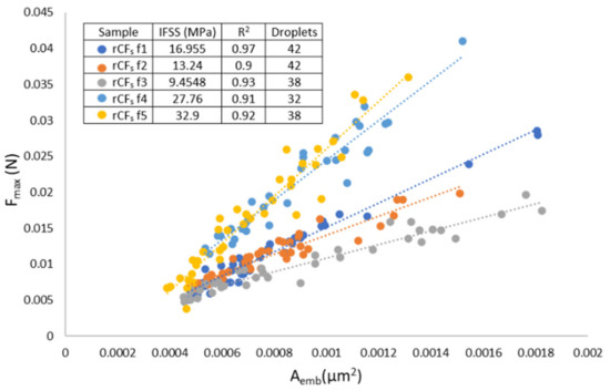In Figure 3b, the larger deviation of the un-sized rCFs IFSS results was because one of the measured fibers (rCFs f3, see Figure 5) had lower IFSS than the bulk of the results. As seen from Figure 5, all of the measured fibers had excellent linear fits, with R2 values over 0.9. This means that the measurement and the results were highly accurate and represented the data very well. In fibrous material, systematic deviation occurs naturally along the fiber length [23]. This natural variation in the fiber surface properties was visible in the CF results as well, but it was more pronounced in the rCFs results due to changes in the fiber surface structure induced by the recycling process. This phenomenon will naturally further contribute to the larger overall deviation.