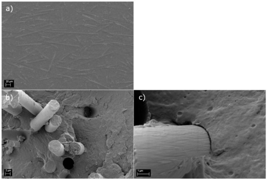A Zeiss ULTRAplus (Zeiss, Oberkochen, Germany) field emission gun SEM was used for detailed imaging of the fibers and of the failed fiber–matrix interphases after micro- and macroscale testing. To minimize charging and to improve image quality, the microscale test samples were attached to aluminum sample holders with carbon tape and coated with a ~3 nm layer of palladium and platinum (ratio: Pt/Pd 80/20 wt%) mixture. Polished cross-sectional samples were prepared from the macroscale use case components in addition to the fracture surfaces. The cross-sectional samples were taken parallel to the fiber direction to allow evaluation of the fiber length. However, as the exact orientation of the fibers is challenging to define from an injection molded structure, some deviation from the actual fiber length were expected towards shorter lengths. The fiber length was calculated from 100 random fibers based on the SEM image analysis done with the open-source software ImageJ (https://imagej.nih.gov/ij/, accessed on 28 December 2021).