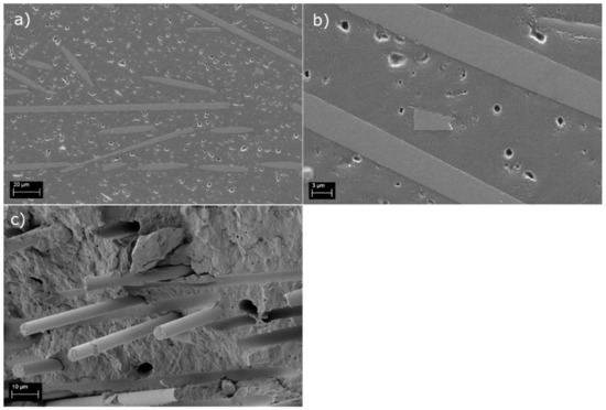 Polished cross-section (a) and fracture surface (b,c) of the PA6 rCFs compound.