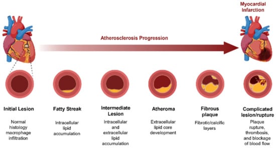 Coronary artery disease: scheme of atherosclerosis progression leading to myocardial infarction (Created in BioRender.com).