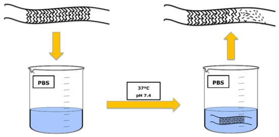 When bioresorbable materials are used to manufacture vascular stents, it is necessary to know their degradation profile. It is essential to evaluate the degradation kinetic since it determines the time range during which the mechanical properties are still adequate [30]. The degradation process must consider the type of material, molecular weight, crystallinity degree, and the pH of the surrounding environment [31]. Moreover, the degradation rate is also influenced by the processing technique used to fabricate the vascular stent [32]. Regarding the degradation of bioresorbable stents, several authors have described some in vitro procedures to assess the degradation profile, namely immersion in simulated body fluid (SBF) and immersion in phosphate-buffered solution (PBS) (Figure 2) [33,34].