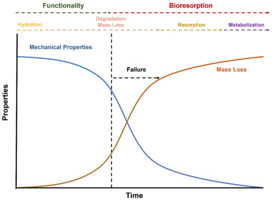 The degradation of this material starts with the diffusion of water molecules into the polymeric chain. After, there is a decrease in the molecular weight due to the hydrolysis that breaks the ester bonds. Over time, this process leads to the fragmentation of the polymer, causing mass loss and reducing the mechanical strength. The breaking of the ester bonds leads to the formation of lactic acid [46,55]. Lastly, this product is converted into pyruvate, which enters the Krebs cycle, and CO2 and H2O are originated as final products, being eliminated from the body via lungs or kidneys (Figure 6) [56].