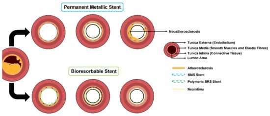 Biodegradable stents have been investigated and credited as the fourth revolution in the stenting field as a possible solution for the treatment of coronary artery disease [41]. This type of stent provides temporary scaffolding to the arterial wall and then is degraded and resorbed by the human organism (Figure 3). Bioresorbable stents have either degradable polymers or metals as the base material of the core structure [41]. Compared to metals, polymers have the advantage of being less dense, more flexible, and easy and cost-effective to modify [42].