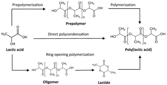 Routes of poly(lactic acid) (PLA) synthesis from lactic acid [53].