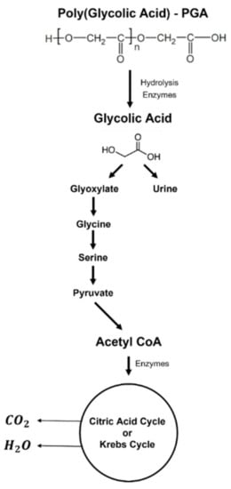 Like other polyesters, the degradation of PGA starts with the hydrolysis of ester linkages. In the first stage, the water molecules diffuse into the polymeric network. Then, the hydrolytic chain scission occurs in the amorphous domains, while the crystalline regions suffer hydrolytic degradation [62]. The resulting monomer is glycolic acid, which is metabolized through several metabolic pathways. The final metabolites are excreted via urine and respiration (Figure 7).