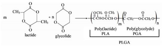 Poly(lactic-co-glycolic acid) or PLGA is a copolyester synthesized through the copolymerization of PLA and PGA [54]. This copolymer offers the ability to tailor several properties and characteristics, e.g., mechanical properties, wettability, and degradation rate, by changing the PLA/PGA ratio [60]. Usually, PLGA is copolymerized by two main processes: (1) direct polycondensation of glycolic and lactic acids and (2) ROP of cyclic lactide and glycolide (Figure 8) [62].