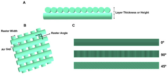 Schematic representation of some FFF printing parameters: (A) layer thickness; (B) air gap, raster orientation, and raster width; (C) examples of raster angles.
