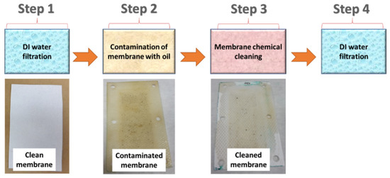 A custom-made cross-flow module was used for the oily wastewater separation. The flow rate of the feed was stable at 15 L/min. Figure 1 shows the experimental steps for the chemical cleaning process (Stage 2). A highly concentrated engine oil/water mixture (oil properties and the company name were not provided by the supplier) was used as a feed solution for the fouling of the membranes. Firstly, distilled water (DI water) was used as the feed for 60 min and its permeability was recorded (Step 1). Secondly, the membranes were exposed to oily wastewater for 180 min (Step 2). If the membrane permeability did not decrease to zero, then Step 2 was continued until the permeability stopped. After the membranes were totally blocked, a chemical cleaning agent added to the DI water was used as the feed for 10 min (Step 3). The DI water was used as the feed for the cleaned membranes for 60 min and their permeability was recorded (Step 4).