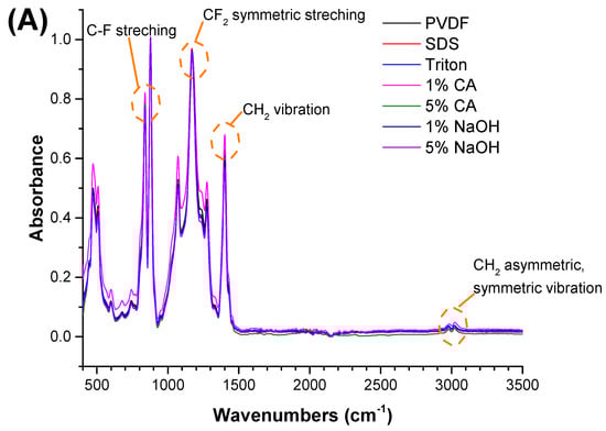 Clearly, none of the chemical cleaning agents showed any damage on the membrane surface after 24 h of immersion. The surfactant effects were observed under SEM and FTIR (Figure 2). Surfactants did not affect the PNMs.