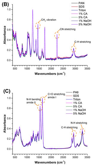 In the first stage (Stage 1) of the experiment, the PA6, PAN, and PVDF PNMs were immersed into two different concentrations (1 and 5 wt.%) of NaOH and CA, and only 2 wt.% of surfactant triton and SDS during 24 h. The aim was to investigate the effect of selected alkaline and acidic chemical cleaning agents on nanofiber membrane surface morphology.