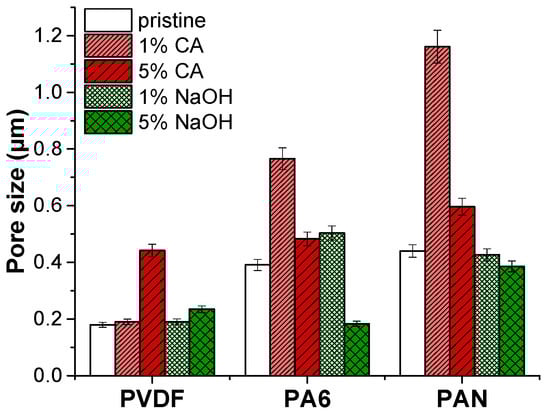 PAN is hydrolyzed in alkaline conditions, and nitrile groups on the PAN membrane surface turn into functional carboxylate groups. PAN hydrolysis has been employed in the preparation of highly hydrophilic membranes [31,36]. Increasing the NaOH concentration yielded a decrease in the contact angle of PAN PNM. The citric acid did not significantly influence the membrane water contact angle.