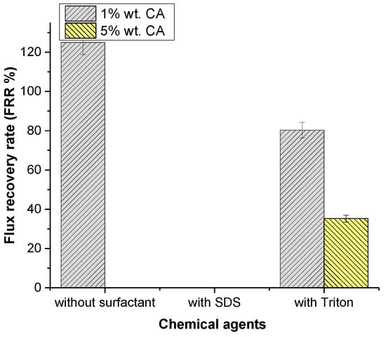 The effect of various surfactants on cleaning membranes was investigated and the results are shown in Figure 6. When SDS was compared to Triton, Triton had an undeniable effect on flux recovery, with 80.81%. Contrary to the literature, Triton improved the hydrophilicity of the membrane’s surface at low CA concentrations, but it had less influence on the flux increase compared to individual CA cleaning agents. This issue may be related to an increase in roughness. SDS was observed to completely stop flux recovery. When the contact angle results were examined, it was evident that SDS reduced the surface’s hydrophilicity. Once the SDS surfactant micellizes, SDS colloids may cause membrane fouling as colloidal deposition on the membrane surface results in membrane fouling [48]. There was a decrease in the flux as a result of fouling. Triton appears to considerably boost the membrane’s hydrophilicity, as can be seen in Table 9. Improvement was also seen in flux recovery as the hydrophilicity increased.