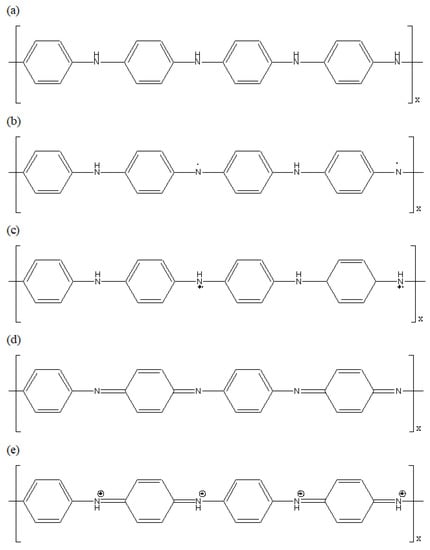 Different oxidation states of PANI. (a) leucoemeraldine (white/colourless); (b) emeraldine base (blue); (c) emeraldine salt (green); (d) pernigraniline base (violet); (e) pernigraniline salt (blue).
