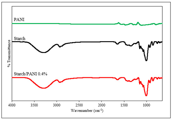 FT-IR spectra of pristine PANI, starch, and starch/PANI 0.4% polymer films.