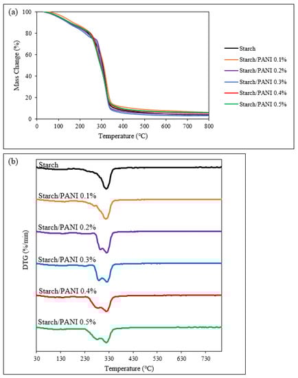 For the starch/PANI (0.1, 0.2, 0.3, 0.4, 0.5%) films, there is a similar degradation pattern with four decomposition stages. Similar to the starch film, the first stage of decomposition (116–140 °C) is due to the evaporation of moisture. There is a new decomposition stage at (189–236 °C) which occurs during the decomposition of HCl dopant [59]. However, the TGA transition step and DTG peak for the decomposition is very weak, as the PANI content in the polymer film is extremely low. Thus, this decomposition stage is too weak to be observed in starch/PANI 0.1%. The third (277–292 °C) and fourth decomposition (317–319 °C) stages are related to the evaporation of glycerol and decomposition of starch, respectively. Although the thermo-oxidative decomposition of the PANI backbone should occur around 300 °C, it is nonetheless not observed in the thermograms [59,60]. The absence of the degradation step might be due to the overlapping degradation temperature with the starch chain and the very small amount of PANI in the polymer film.