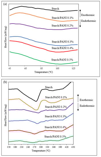 DSC thermograms of starch and starch/PANI (0.1%, 0.2%, 0.3%, 0.4%, 0.5%)-polymer films from (a) 45 °C to 130 °C and (b) 150 °C to 450 °C.