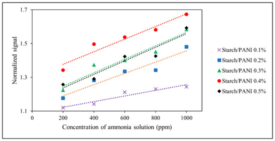 On the other hand, for the starch/PANI 0.1% to 0.4%, it can be seen that the sensor response improves more significantly when the concentration increases from 200 ppm (1.12–1.34) to 1000 ppm (1.24–1.67). At lower concentrations, the sensor responses of starch/PANI 0.1% to 0.4% are similar due to the limiting factor of ammonia concentration. Therefore, the increase in PANI concentration will not largely affect the sensor response, leading to a mild increase in sensor response. At higher concentrations, there are more ammonia molecules to interact with PANI and it is no longer a limiting factor, thus resulting in a more obvious increase in sensor response.