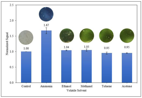 The sensitivity of the sensor was monitored based on the changes in colour signals mentioned in Equation (1) where the normalised change in colour signal was obtained by dividing the change in colour signal of the sample by the change in colour signal of control sample.