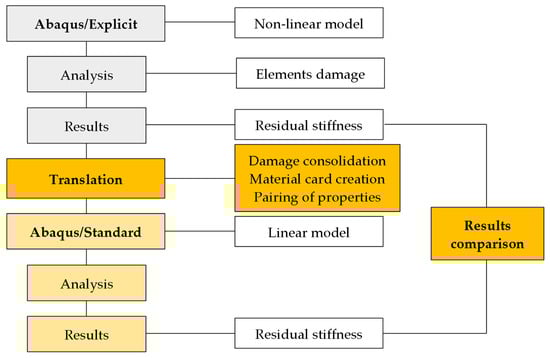 In the field of mechanical engineering, there are several problems that need to be solved by numerical methods. To increase their efficiency, individual procedures have been developed for individual tasks and solvers have been adapted. The most common variants of the solution include a linear or nonlinear variant of the calculation following an explicit or implicit scheme [,]. Individual calculation schemes differ in mathematical formulation, stability and speed of computation. Linear solvers are based on the assumption that the force in the model increases with increasing deformation during the calculation [,]. If this condition is violated, the task becomes poorly conditioned and the calculation cannot be successfully performed []. However, the phenomenon of force drop in the model occurs in all tasks that are focused on the study of the state of structures in a broken state [,,,] beyond the strength reached before total structural collapse [,,,,]. This can occur, for example, due to a collision between fast-moving objects []. For these reasons, violation tasks are calculated with the help of solvers following the so-called explicit scheme. They do not require the condition of increasing forces in the model; they are stable but only suitable for simulations of fast or quasi-static processes. Because the tasks for individual solvers are formulated differently, it is necessary to ensure appropriate continuity between them. Thus, the order of calculations, which are based on different calculation schemes, cannot be created completely arbitrarily. A good example is the sequence of analyses to determine the stiffness of a composite part before and after failure [], which is the focus of this article, because changes in stiffness can be based on a structural condition monitoring (SHM) system that can determine the damage location of a local stiffness change. First, a linear approach following the implicit scheme is used, then a nonlinear analysis with violation is performed using the explicit solver, and then again, a linear analysis with the implicit scheme follows. As an example, in this work, a method of transferring information from the results of the explicit solver to the model of the implicit solver Abaqus 6.14 is presented. The linearization method is used to transfer information between individual models. The main motivation of this study is that there is no communication between solvers and there are not enough resources to address a similar issue in such a direct way, as addressed in this work. Furthermore, a commercial software translator providing the translation of models does not currently exist. This paper focuses mainly on composite material failure, such as has been referred to in previous studies [,,,,,]. In general, the linearization (model conversion) procedure can be applied to all materials and implicit solvers. The aim of the article is to find a unique and highly efficient linearization method, which is theoretically verified.