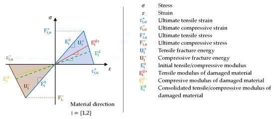 A graphical interpretation of the stress response of the composite material to deformation in the main direction of anisotropy is shown in Figure 2 [,]. The diagram does not express all the key points of Hashin’s theory, instead showing only those that are essential in this paper and for the solver used [].