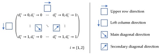 The graphical display illustrates the consequence of the relationship of the selection group of elements at the level of one direction of damage. While Figure 4 presents the consolidation of the damage parameter in the direction of the main diagonal, Figure 5 shows the direction of the side diagonal. Figure 6 describes the variation of damage in the top row direction, and Figure 7 displays the direction of the left column of the variation scheme. It is obvious that the damage values can take values that are only in the interval from 0 to 1.