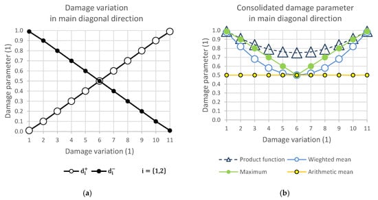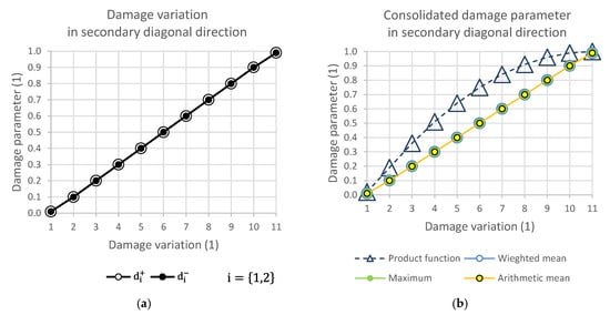 (a) Damage variation in secondary diagonal direction; (b) consolidated damage parameter.