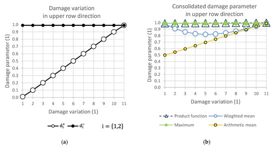 (a) Damage variation in upper row direction; (b) consolidated damage parameter.