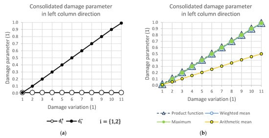 Figure 4, Figure 5, Figure 6 and Figure 7 show the relationship of the consolidation functions to the damage variation according to the diagram shown in Figure 3.