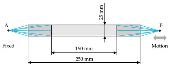 The simulation of the laminate sample tensile test was carried out according to ASTM D3039. The sample dimensions of the experiment diagram are shown in Figure 8. At point A, the sample was completely fixed; at point B, a kinematic excitation was introduced, which follows the course shown in Figure 9.