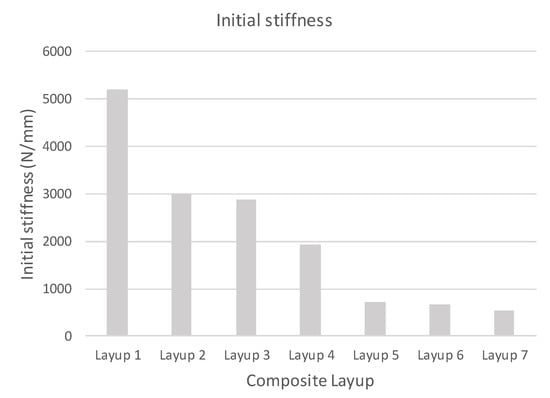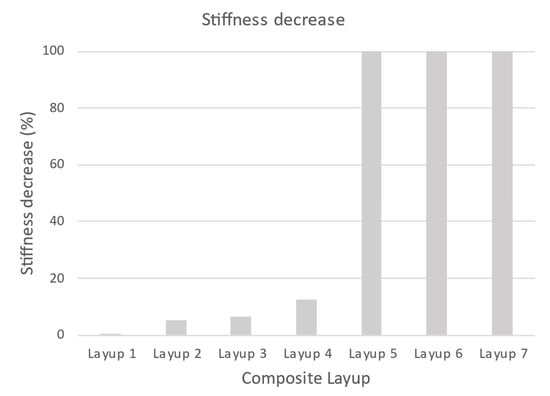 The agreement of the residual stiffness results, compared with a reference value, is shown in Figure 12. The deviance from the reference solution is referenced in Table 9. It represents a comparison between the initial stiffness calculated with a linear solver and residual stiffness calculated by an explicit solver. It is visible that the decrease in stiffness depends on the composite layup, while the applied load cycle is the same. This was the aim, because the influence of fibre orientation has been considered. In this case, the result of the nonlinear simulation of cycle 1 was considered to be the reference value.