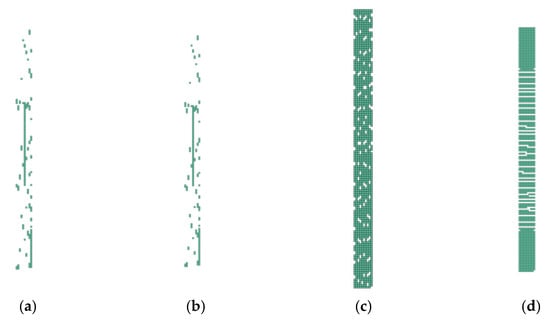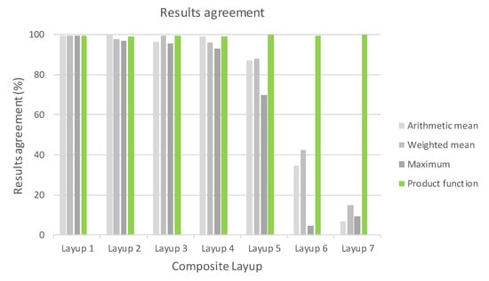 It is important to note that where there was no (Figure 13) or complete damage, all consolidating functions except the arithmetic mean results were the same. This is consistent with Figure 4, Figure 5, Figure 6 and Figure 7. Thus, it means that Layup 1 and Layup 6 and 7 should theoretically have the same results; however, this did not occur. This was caused by the results of the linearization of several elements which are not completely damaged (though may be partially damaged). This error cumulates and because the stiffness depends on the spatial distribution of the element, the deviation from the true value is very high. This small difference is shown in Figure 14c,d and Figure 15c,d. It is visible that the number of elements is nearly the same, but only the cracks in Figure 14d, Figure 15d and Figure 16d are correct and acceptable.