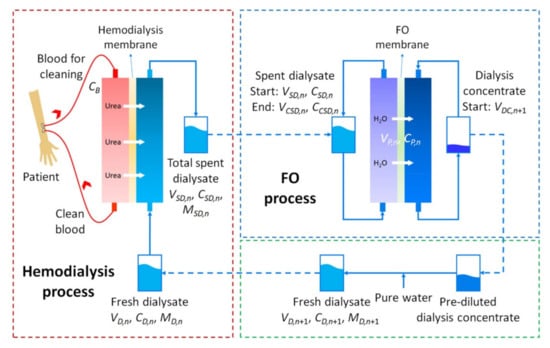 Scheme of the combination of the hemodialysis and spent dialysate recovery by osmotic dilution. A partial amount of water in the spent dialysate spontaneously moves toward the dialysis concentrate, as a consequence of the osmotic pressure gradient across the FO membrane. After FO, a certain amount of pure water is added to further dilute the dialysis concentrate. The dialysate without recovered water from the spent dialysate is used in the first hemodialysis session (reproduced with permission after []).