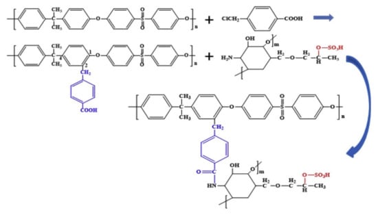 Yan et al. [] functionalized PSF with sulfonated hydroxypropyl chitosan and 4-(chloromethyl)benzoic acid in order to improve hemocompatibility. The 4-(chloromethyl)benzoic acid was grafted on PSF via the Friedel—Crafts alkylation reaction, providing available carboxyl groups, followed by the grafting of sulfonated hydroxypropyl chitosan via esterification (Figure 4). The functionalized membrane presented increased hydrophilicity and remarkable hemocompatibility, and the hemolysis rate decreased after functionalization. The contact angle decreased after grafting, from 86° for neat PSF to 59° after functionalization through the addition of carboxyl groups into sulfone after adding 4-(chloromethyl)benzoic acid. The reaction time of PSF functionalized membrane with 4-(chloromethyl) benzoic acid and sulfonated hydroxypropyl chitosan had a decreasing effect on the contact angle, such that, after 12 h of reaction time, the contact angle decreased up to 47° and, after 24 h of reaction time, the contact angle decreased up to 32°. These results showed an exceptional increase of the hydrophilicity, which could lead to an improved hemocompatibility.