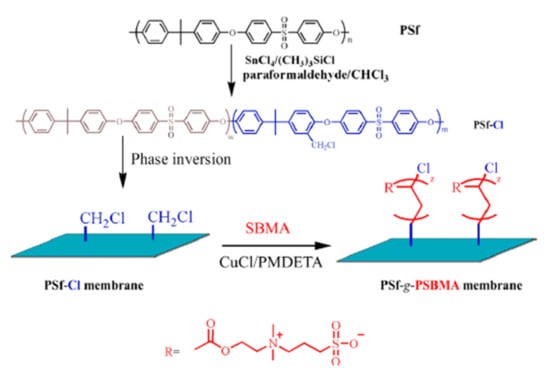 The preparation of PSF—Cl membrane, and P(SBMA-b-NaSS) and P(SBMA-co-NaSS) grafted membranes (reproduced with permission after []).