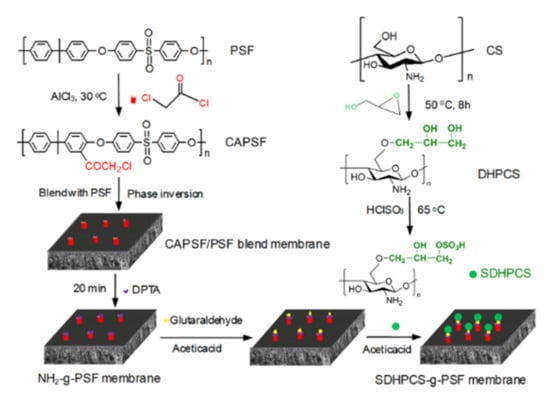 The preparation process of SDHPCS-g-PSF membrane (reproduced with permission after [], Scheme 1).