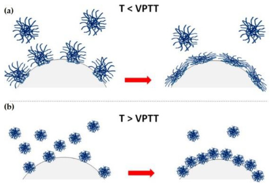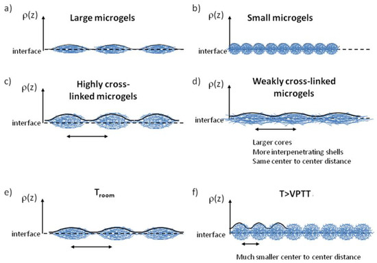 Sketch of the conformation of microgels adsorbed at a fluid interface from temperatures below (a) and above (b) the phase volume transition (VPTT: volume phase transition temperature). Adapted from Wu et al. [52] with permission from the American Chemical Society, Copyright (2019).