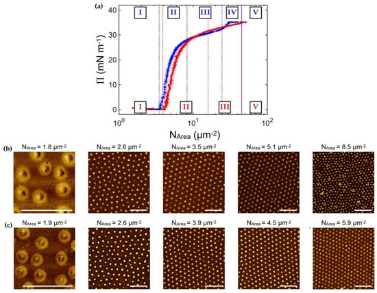 Bockenek et al. [45] defined, for temperatures below the volume phase transition, the existence of up to five different regimes in the phase behavior of microgels adsorbed at fluid interfaces as a function of the interfacial coverage, independent of their specific chemistry. These regimes are identified as (i) the diluted state, (ii) corona-to-corona contact, (iii) isostructural phase transition region, (iv) core-to-core contact, and (v) monolayer failure. However, the core-to-core contact regime disappears at temperatures above the VPTT. The existence of the regime corresponding to the corona-to-corona contact is surprising and can only be explained in terms of the swelling thermodynamics. Thus, considering the size of a neutral microgel in bulk, its size is determined by a complex interplay between the free energy and the temperature-dependent solvent–polymer mixing free energy [70]. This framework needs to be extended when microgels are adsorbed at a fluid interface to include an additional term accounting for the surface free energy gain, which is greater than the mixing ones, and nearly constant with the temperature [9,22,38,42,71]. This leads to a situation in which the part of the microgel network in contact with the interface remains stretched until the elastic contribution can counteract the surface free energy contribution. The thermoresponsiveness of the portion of the microgels protruding into the aqueous phase remains unaltered. Figure 3 shows the change in the surface pressure, Π, as a function of the number of microgels per area unit, NAREA, at two different temperatures, and the corresponding AFM images obtained for the different states of the monolayer. The transition between the diluted states to the regime characterized by the corona-to-corona contacts is accompanied by a sharp increase in the surface pressure. A further increase in the surface coverage pushes the system to the emergence of an isostructural phase transition. This is characterized by the melting of the initial lattice, and the formation of a second hexagonal phase with a smaller lattice parameter; during this transition, the surface pressure changes very slowly with the increase in the interfacial coverage. Once the second hexagonal phase is completely formed, the behavior becomes very different depending on the temperature. At high temperatures (above the volume phase transition temperature), the monolayer fails, probably due to the buckling, formation of multilayers, or desorption [58,72]. On the other hand, at temperatures below the volume phase transition, an additional phase characterized by a further increase in the surface pressure emerges before the monolayer failure is observed (regime iv). However, the monolayer failure occurs at similar values of the surface pressure independent of the temperature. This can be understood considering that there is a maximum amount of polymer segments that can be confined at the interface before the failure. This limit can be reached by two different routes: (i) the increase in the lateral packing of the film, forcing a 2D collapse, or (ii) the increase in the temperature, forcing a 3D collapse.