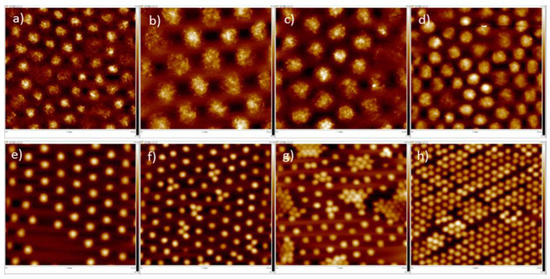 Atomic Force Microscopy images of Langmuir–Blodgett deposits obtained from low cross-linked (a–d) and high cross-linked (e–h) PNIPAM microgels at the water/vapor interface, obtained at increasing values of the interfacial coverage (from left to right). Reprinted from Picard et al. [75] with permission from the American Chemical Society, Copyright (2017).