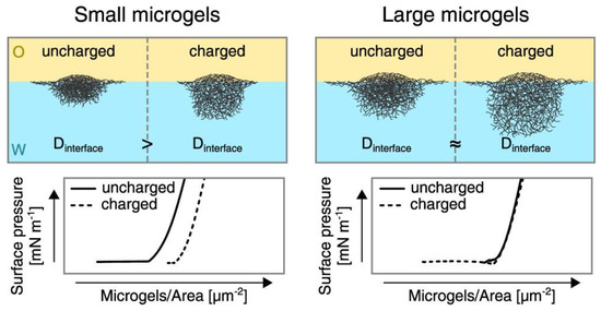 The electrostatic interactions are also very important for the control of the in-plane organization of microgel particles at fluid interfaces. This can be understood as a consequence of the different deformability of the charged microgel particles. Thus, charged microgels at water/fluid interfaces undergo a higher compression than uncharged ones at low values of the interfacial coverage, and, consequently, the area occupied by the particles is reduced with the reduction in the charge density. This results from the impact of the inter-particle interactions in the lateral organization of the particles at the interface. However, the effect of the charges in the microgel compressibility becomes negligible for large microgels, and hence the lateral inter-particle interactions do not modify the in-plane organization of microgel particles at the interface. This can be explained by considering the dominant role of the volume contribution to the free energy over the interfacial ones. The situation becomes very different, independent of the microgel size, when the interfacial coverage is increased. In this situation, the differences in the compressibility between charged and uncharged microgels lead to changes in the length-scale of the interactions occurring between the microgel fractions protruding into the aqueous phase for charged and uncharged particles, as a result of the different swelling degrees of the particles. Therefore, the increase in the interfacial coverage introduces the contribution of the out-of-plane interactions between microgel particles, which modify the in-plane organization of the particles at the interface [76]. The differences in the organization of microgels with different charge densities at the interfaces can be more clearly understood by comparing the surface pressure–area isotherms depicted in Figure 5, together with the conformation expected for the particles at the fluid interface characterized for the diameter of the projection of the particle at the interface (Dinterface).