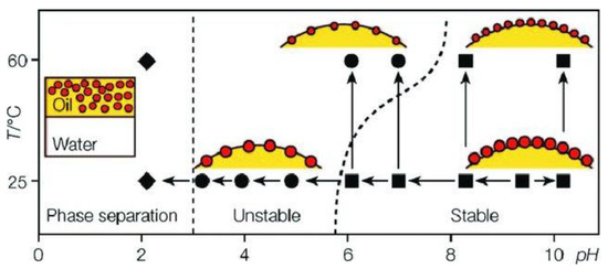 Stabilizing efficiency of PNIPAM microgel particles for oil-in-water Pickering emulsions as a function of pH and temperature. (■) Stable emulsions, (●) unstable emulsions and (◆) phase separation. Reproduced from Ngai et al. [84] with permission from the Royal Society of Chemistry, Copyright (2005).
