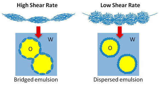 Destribats et al. [79] also proposed that the organization of microgels at the water/oil interface may be tuned by changing the methodology used for the preparation of the microgel-laden interface. This decisively impacts the stability of microgel-stabilized emulsions. The use of methodologies relying on the application of different energies allows for the control of the water/oil interface deformation and the microgel packing density. Thus, the strong flattening of the microgels at the interface induced when emulsions are prepared by methodologies based on the application of high shear rate deformation limits the maximum coverage of the droplets, and favors their flocculation (bridged emulsions). On the other hand, the interfacial coverage increases as a result of the adsorption of laterally compressed microgels, which prevent droplet flocculation when low shear rates are applied for emulsion preparation. Figure 8 displays a sketch of the effect of the shear rate on the droplet dispersion within the continuous phase.