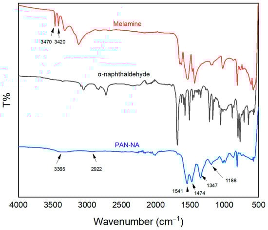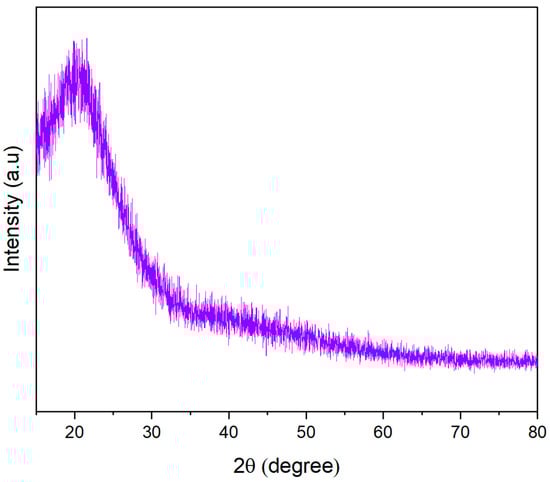 In Figure 3, the powder X-ray diffraction (PXRD) pattern of PAN-NA reveals a wide peak, positioned around 2θ = 20°, corresponding to the most amorphous part [5,23]. The lack of any sharp peaks may indicate the absence of melamine, meaning that all melamine has been reacted.