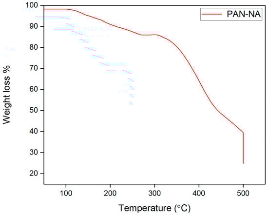 The thermal stability of PAN-NA material was explored by TG analysis and the thermogram is presented in Figure 5. While heating in N2 atmosphere, a weight loss of 5% was noticed up to 145 °C. This may result from the out-gassing of solvents and moisture stuck in the pores of the polymer network. The main weight loss began at a temperature of over 320 °C, due to the breakdown of the network, and the burning began gradually above 400 °C. Our results confirm that PAN-NA is thermally stable up to 320 °C.