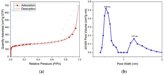 Porosity characteristics are critical parameters influencing the adsorption effectiveness of small molecules on PAN surfaces. In addition, N2 adsorption–desorption isotherms were used to investigate surface areas and porosity characteristics at 77 K. As shown in Figure 6a, the abrupt growth in N2 uptake at the initial relative pressure (P/P0 < 0.01) suggest the presence of extensive micropore materials. Then, in the intermediate pressure range, nearly horizontal adsorption occurs. Furthermore, when relative pressure (P/P0) surpasses 0.8, N2 uptake increases dramatically, indicating the presence of bigger mesopores, which are mostly caused by interparticle voids induced by loose packing of fine particles, as demonstrated by SEM micrographs (Figure 4) [23,25,26]. On the other hand, the polymer exhibits reversible adsorption–desorption isotherms, which differ from the hysteresis phenomena commonly reported in many other porous organic polymers due to pore structural deformation during measurements in liquid N2. As a result of the reversible isotherms, network architectures built with triazine rings and aminal linkages are robust [11].