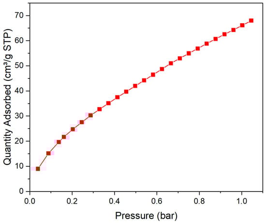 The adsorption isotherm of CO2 is presented in Figure 7. Interestingly, CO2 uptakes increased consistently with increasing pressure and stayed below saturation throughout the experimental range of pressure, implying that a much higher adsorption capacity may be reached at higher CO2 supply pressures. At 273 K and 1 bar, PAN-NA shows a higher CO2 uptake of 67.9 cm3/g (133.32 mg/g), which is larger than the adsorption capacities of other porous polymers [13,27,28,29,30].